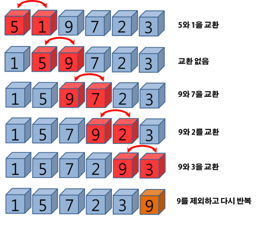 - 각 항목 쌍을 비교하면서, 필요하면 교환하는 동작 방식