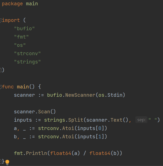 fmt.Println(float64(a) / float64(b))