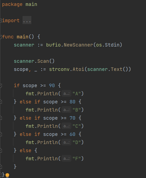 시험 점수를 입력받아 90 ~ 100점은 A, 80 ~ 89점은 B, 70 ~ 79점은 C, 60 ~ 69점은 D, 나머지 점수는 F를 출력하는 프로그램을 작성하시오.
